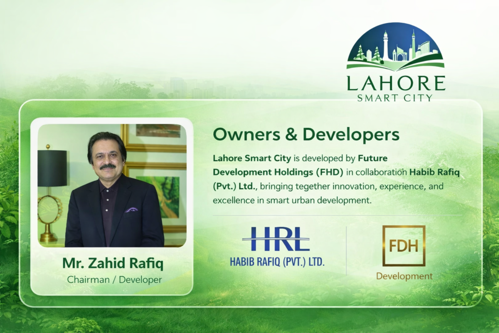 Lahore Smart City is proudly owned and developed by Habib Rafiq (Pvt.) Limited (HRL) in collaboration with Future Development Holdings (FDHL). Both companies are highly reputable names in Pakistan’s real estate and construction industry, known for delivering large-scale, high-quality developments.